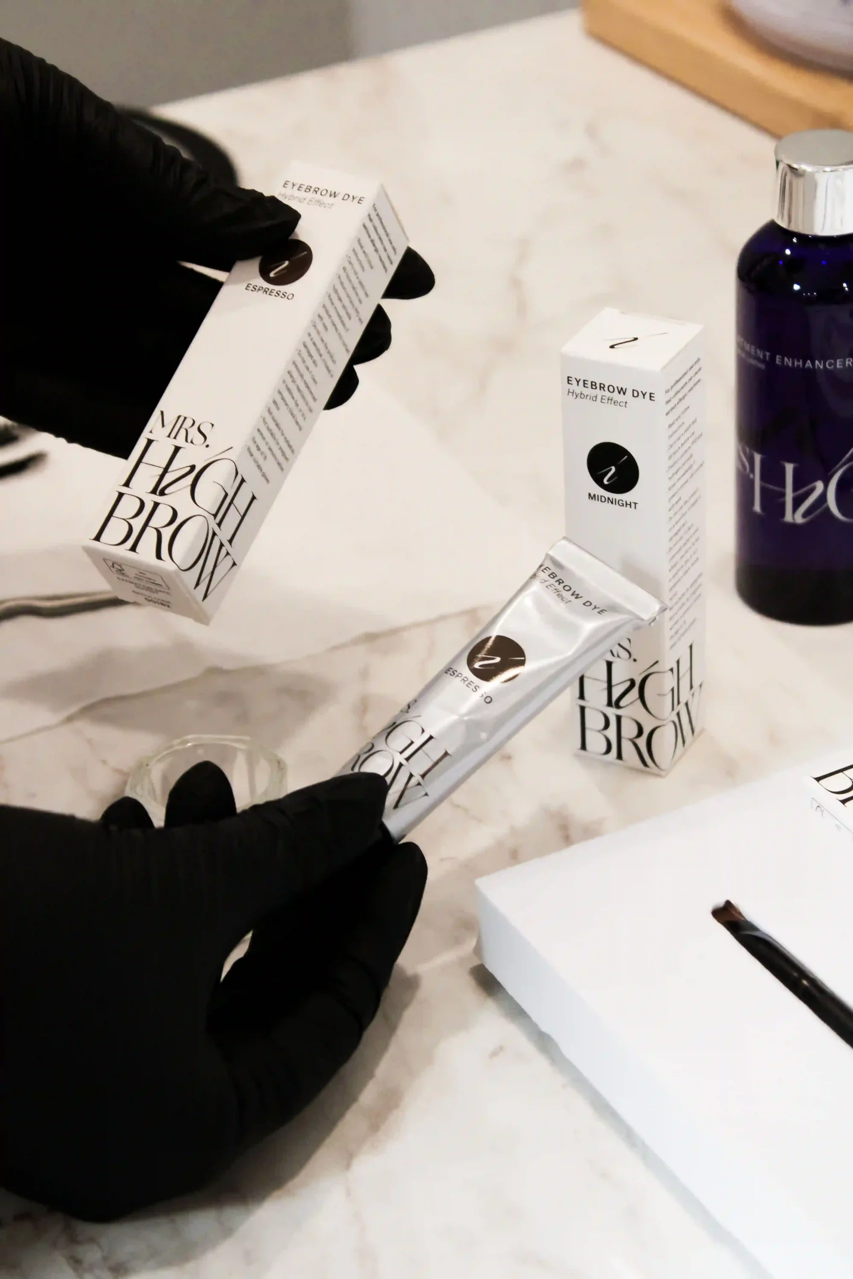 Hybrid verf combineert het beste van wenkbrauwverf en henna. De verf kleurt zowel de haartjes als licht de huid, waardoor de wenkbrauwen voller en strakker ogen.